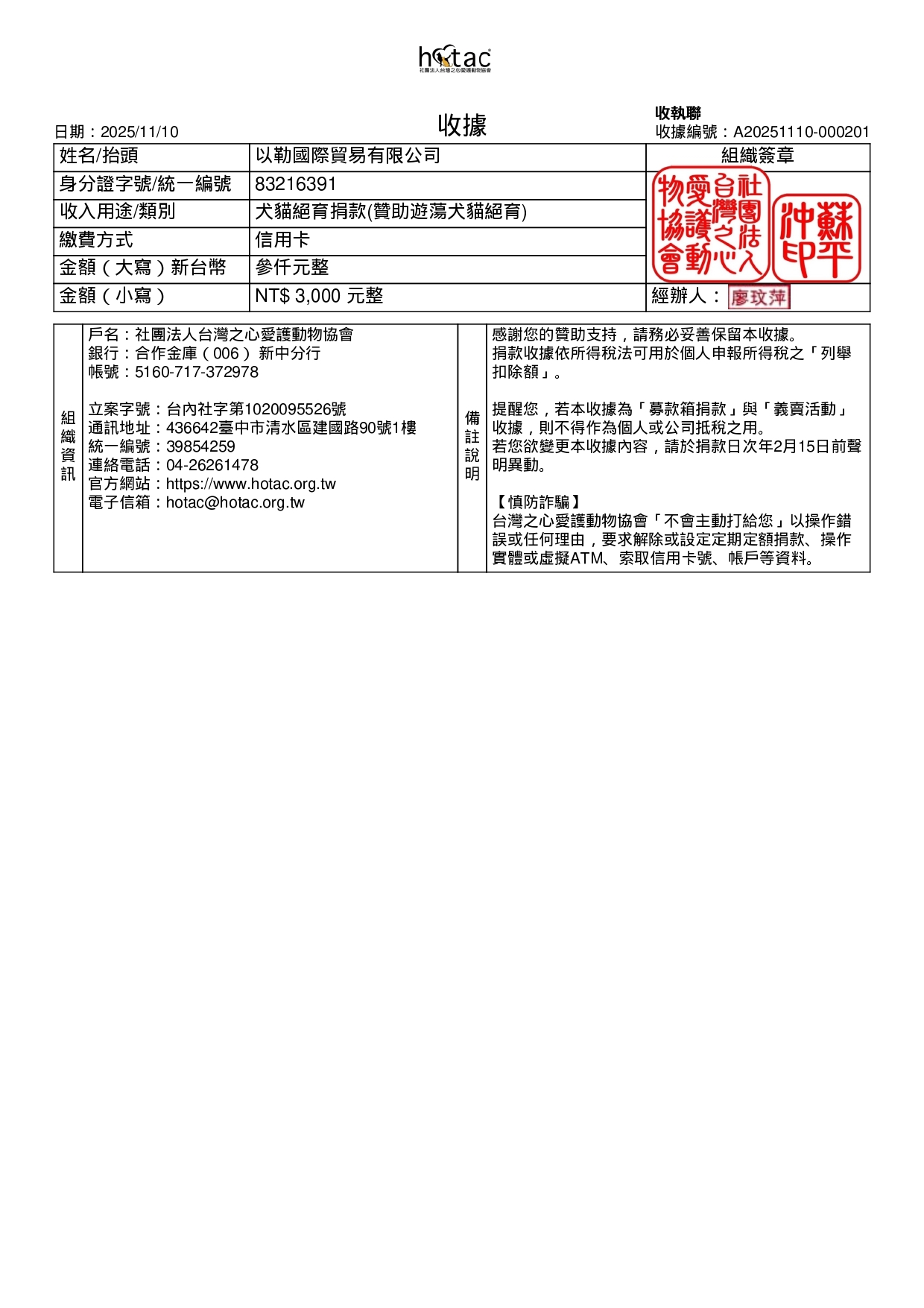 謝謝您的每次購買,以勒將每一季將總收入的1%捐款給需要的團體,做的不多,只希望能幫助到最需要的人/團體/動物!